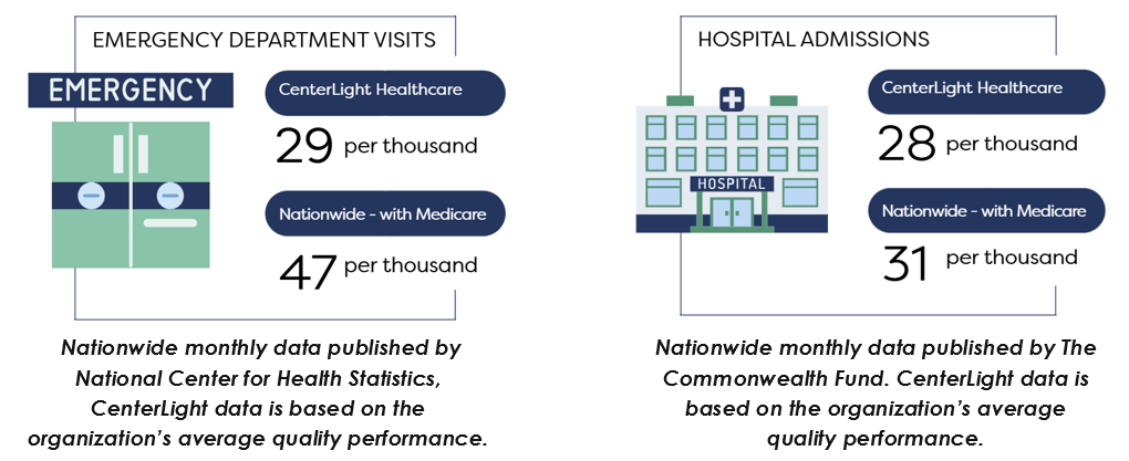 At CenterLight Healthcare Program of All-Inclusive Care for the Elderly (PACE), our goal is to catch problems early or help prevent them altogether, so that our participants can avoid unnecessary hospital stays and remain living in their own home and communities for as long as possible. The importance of Preventive Care is illustrated by the average emergency department visit and hospital admission rates in our participants compared to the nationwide rate: